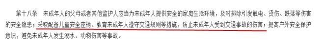 新修订的《未成年人保护法》已于2021年6月1日正式实施,其中,第十八条明确规定:监护人应“采取配备儿童安全座椅、教育未成年人遵守交通规则等措施,防止未成年人受到交通事故的伤害”。