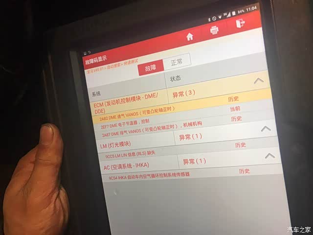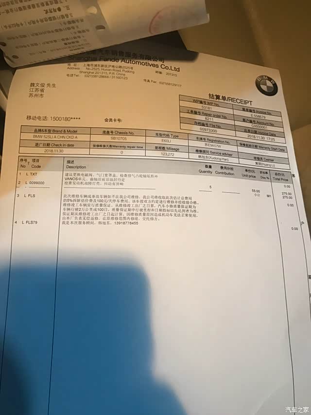 过了几天有时间了,就把车开到苗江路的宝马4s做了检测,检测下来是3个外在故障:1,气门罩盖更换总成并检查vanos进气机械部分。2,更换进排气vanos电磁阀(故障代码2A82和2A87)。3,发电机皮带张紧轮异响(这个是建议更换,这个问题我之前发现了,但和现在抖动故障没有关系)。看了一下要八千多,滴血。付了检测费回家。因为我要再找一家更大点的4s检测确认一下。