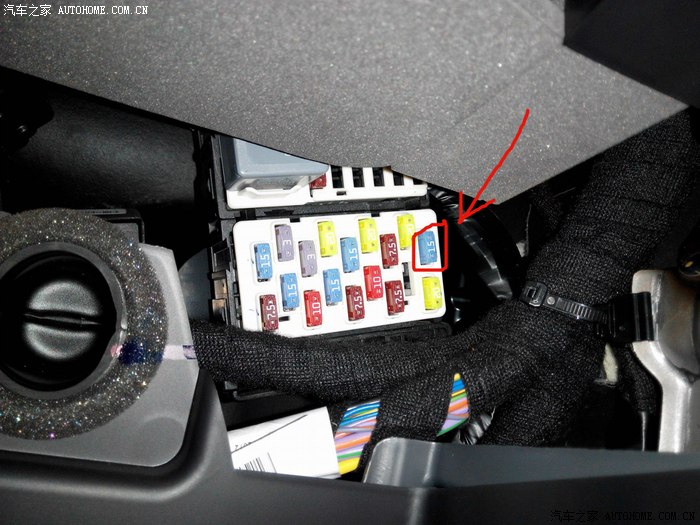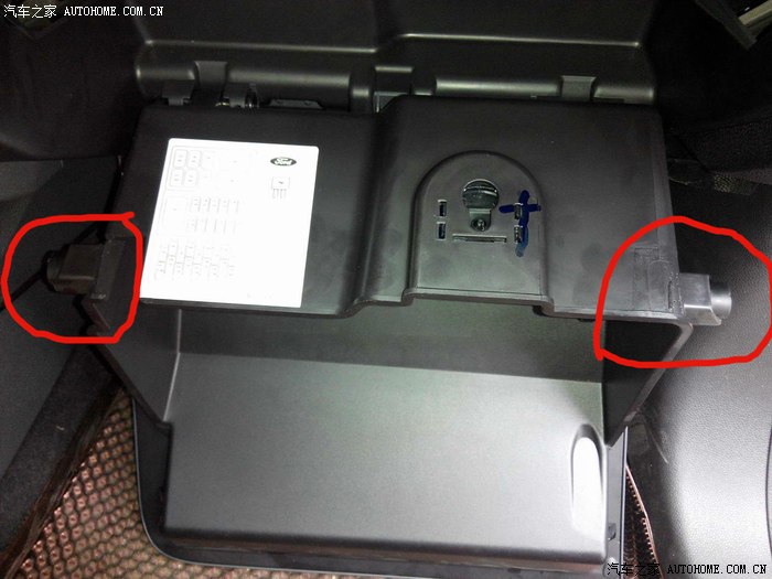 打开副驾驶前方储物盒,开到底,伸手在图中两红圈处用力一别,就可将其全部打开,看到里面的保险丝