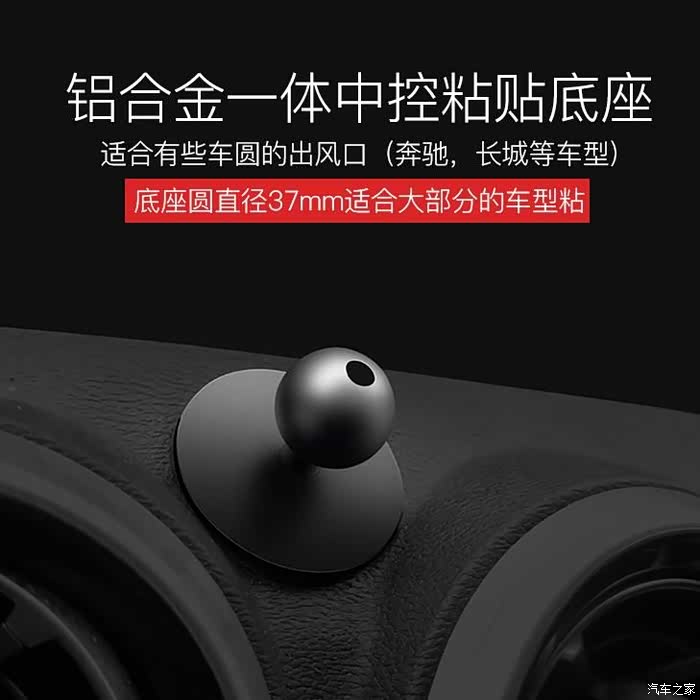 安装位置最终选择在左侧出风口右边的一小块钢琴漆内饰板,这个材质方便粘贴,因为被方向盘遮挡,底座也不会碍眼。这块内饰板面积不大,但是也足够使用。我选择了下图所示的这种铝合金粘贴底座,17mm的标准球头。