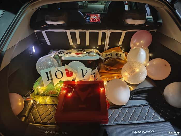 不过今年不一样,有了宝贝爱车——极狐汽车阿尔法t5,也想借着这个“告白神器”,给平淡的生活添点小浪漫。忙完工作,我早早地回到家,在车里把气球吹上,准备给她一个专属告白。