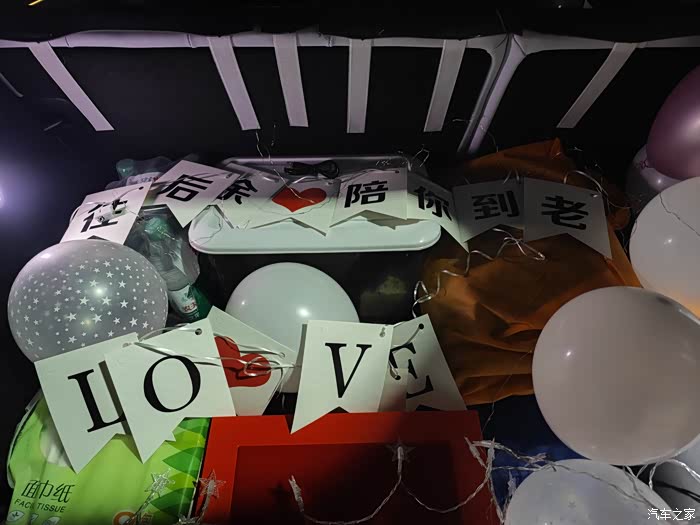 打开后备箱,里面是我提前准备好的小彩灯和气球。在灯光的映照下,格外好看。我拉着爱人的手,走到后备箱前,她眼中满是感动。