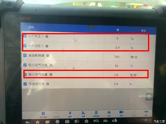 之所以考虑到空气流量计,是数据流发现,怠速时,空流计显示3.4g/s左右异常(标准怠速时在1.8-3.0g/s之间)。照片漏拍了。