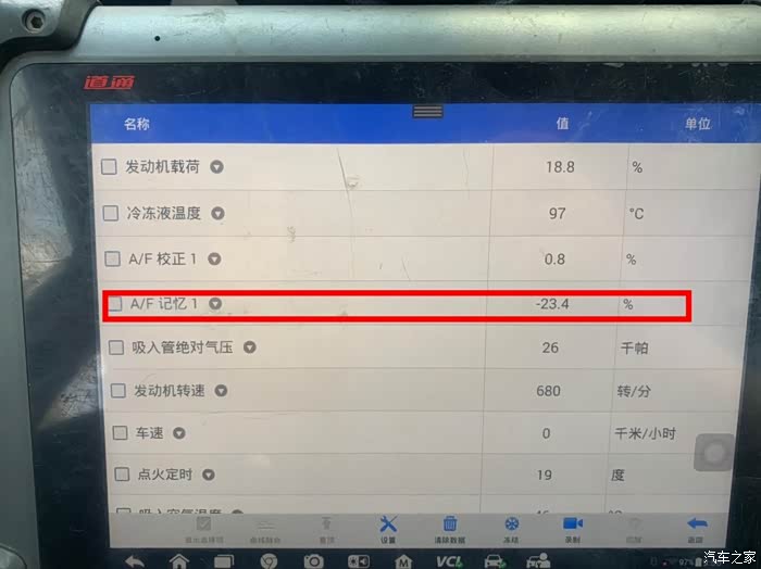 进入发动机系统,分析数据流,发现A/F记忆-22.4%异常,负值代表混合气浓,正值代表混合气稀。(标准暖机后怠速时在正负10%以内)