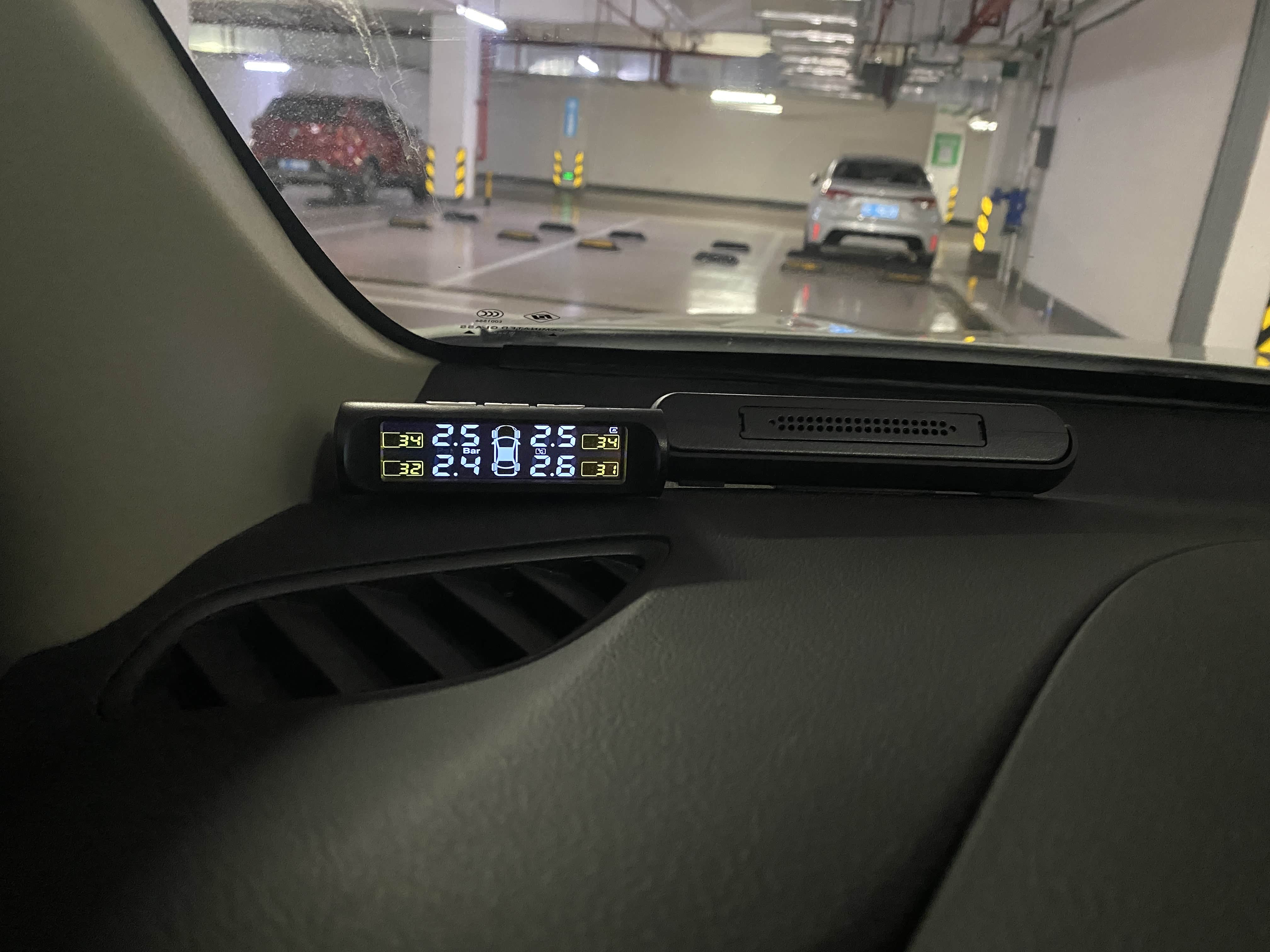 数据可以通过显示屏幕显示; 胎压和轮胎温度; 由于前轮表近发动机,所以气温也高; 有了这个胎压监测,开车安心多了;