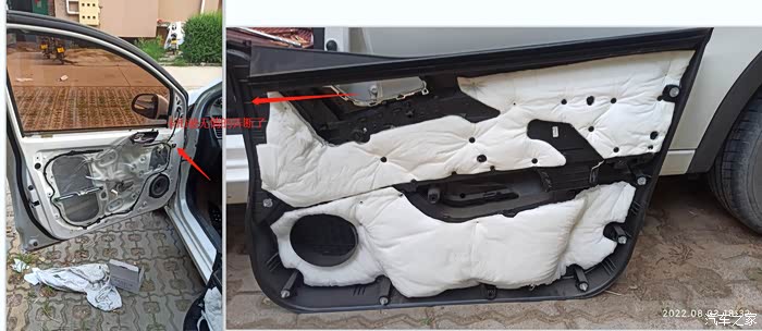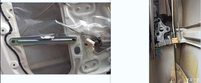 斜撑是固定门板按钮那个拉手的 应该也是门上的加强件,两个10个的螺栓卸掉,揭开防潮塑料, 里面就一览无余了 这材料真心的薄 就一个W型贴片梁和一个圆管铁片钢梁 用手弹弹 真心地薄,纸壳车门 名副其实。这里拍个钢丝连接的照片 以防后期忘掉, 四根钢丝锁,