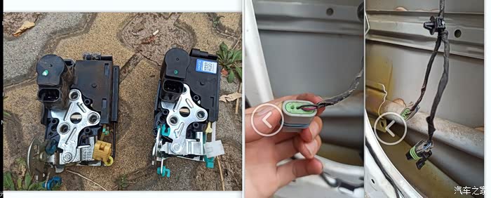 拆下四个链接钢丝 都是卡扣轻轻一掰就可打开, 然后从外面拆下锁上的三个内梅花六角螺栓,就可以把锁那出来了 然后拔下锁上两个插头,就可以把锁取下来了 新旧锁对比一模一样 然后按拆解步骤倒这来 把新锁安装上就可以了 先把中控按钮插头插上 试试门锁 待没问题后 就可以把门板等装饰部件还原了