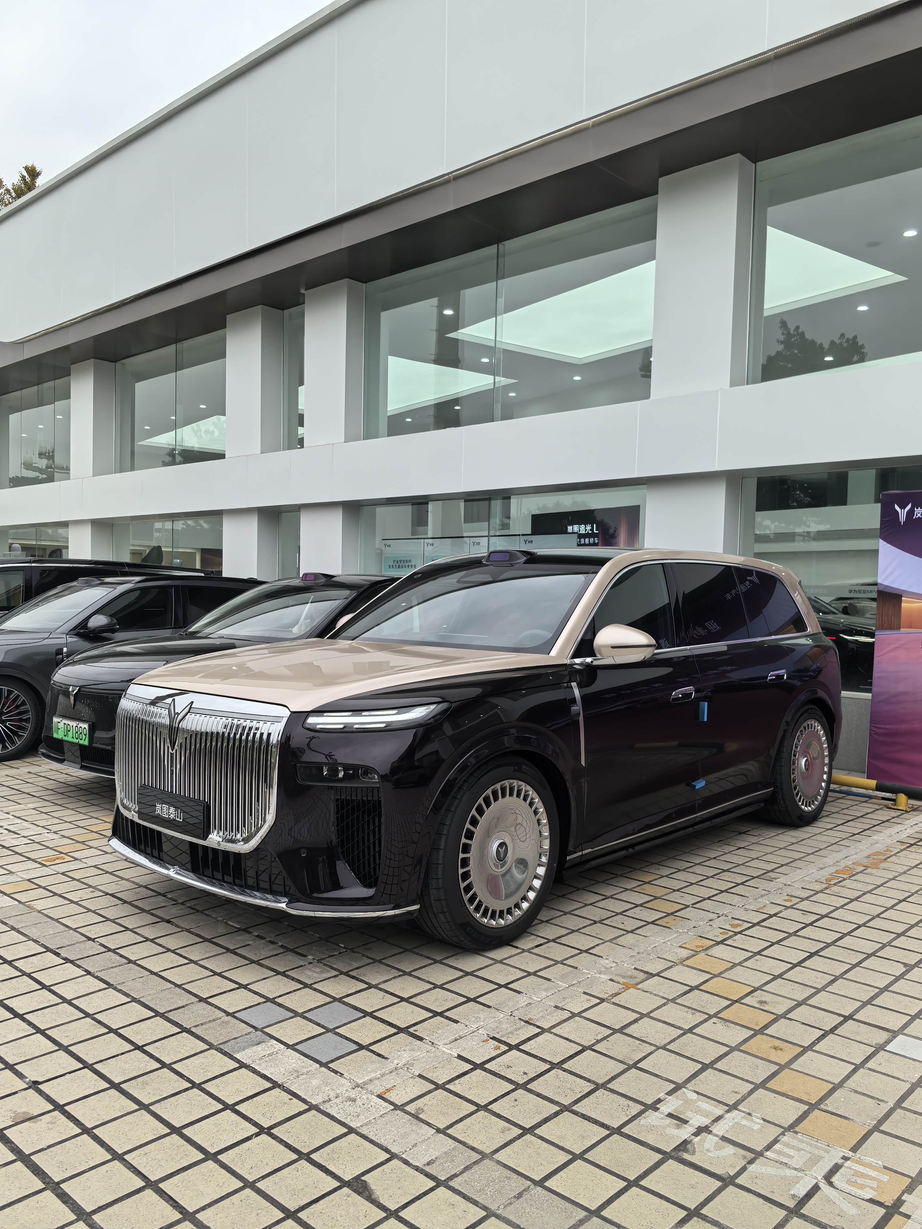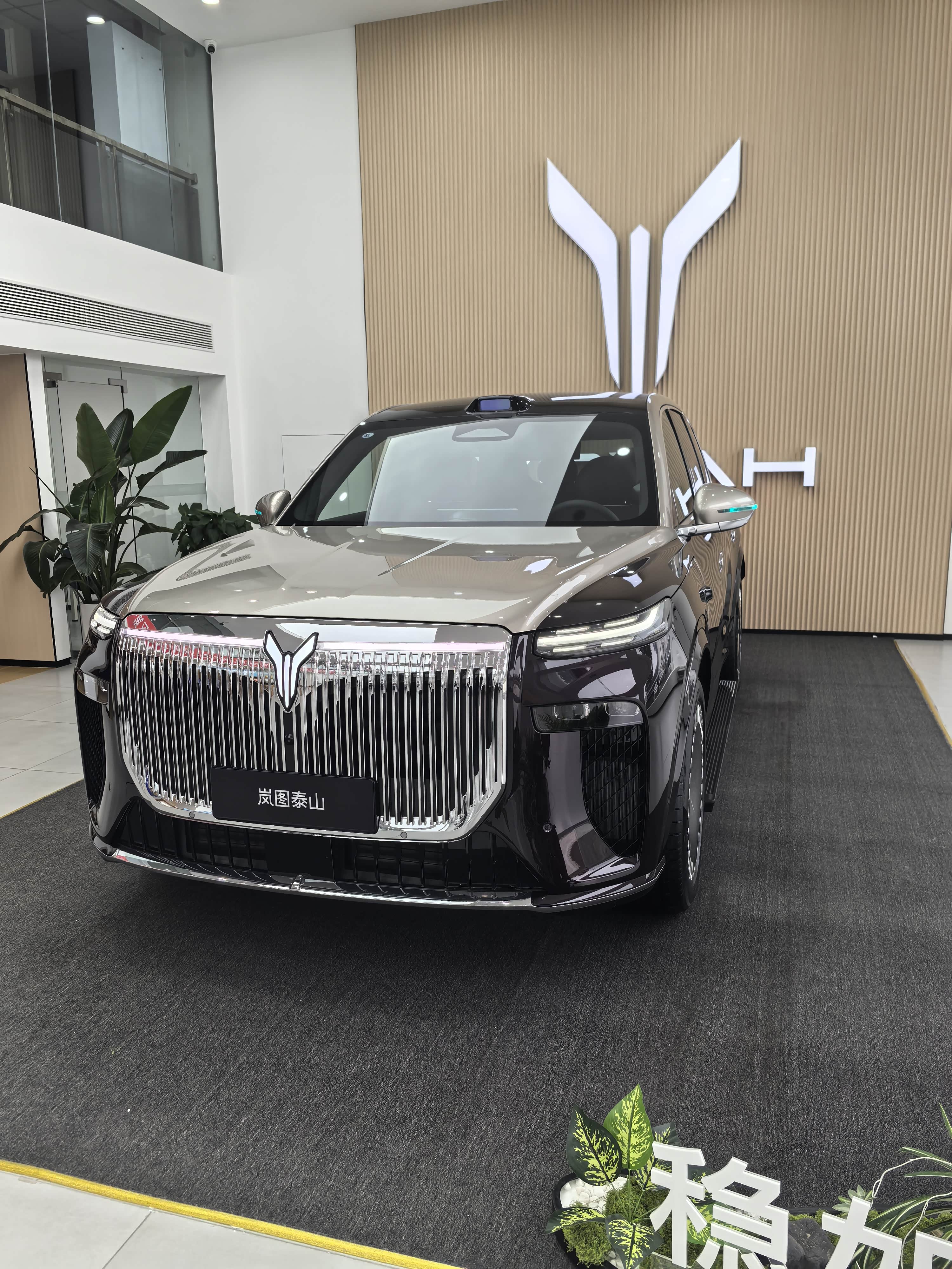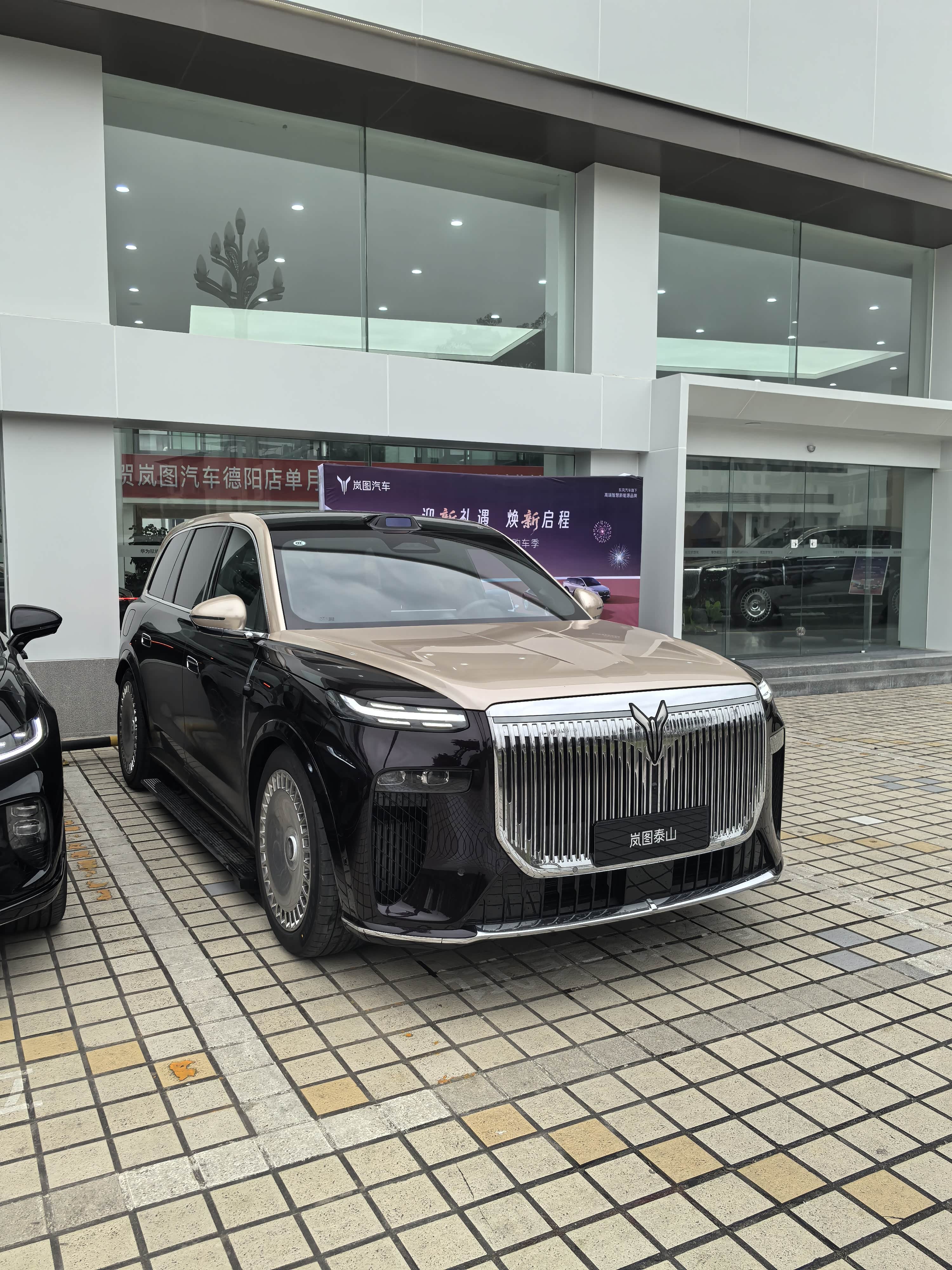 刚走到交互中心门口,就一眼看到了停在展厅外的岚图泰山,黑棕拼色的车身在初冬的阳光下特别扎眼,前脸那一大片镀铬的直瀑式格栅,不是那种浮夸的亮,而是透着股沉稳的气势,往那一站就自带“旗舰气场”。旁边还停着一辆岚图梦想家,不过泰山的气场明显更足,车身看着更高大,线条也更硬朗中带点圆润,不像有些大车看着笨重,光从外观上就能感觉到这是款主打高端舒适的车。