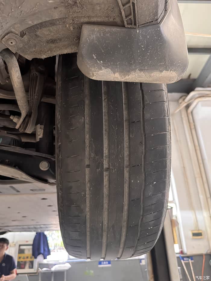 第六次常规保养时,车辆举升检查底盘与轮胎后,维修人员提醒我注意后轮内侧的磨损情况,我进入车间查看,这才发现后轮内侧胎壁已经磨损严重,暴露的钢丝线清晰可见。那一刻,我最大的感触是这轮胎不耐用,按照油车的惯性思维,一条轮胎在日常的使用情况之下,平均行驶里程至少6万公里,难道是因为电车的车重,抑或是先前的胎压偏低而加速磨损,这个不得而知,只能留下了一个疑惑?我打算更换新胎后做个胎压的偏差监测,到时候再来分享。
