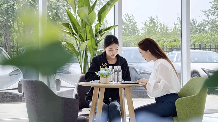 小姐姐认真在把一些提车注意事项跟表姐认真的讲述,一个在认真讲,一个在认真听。