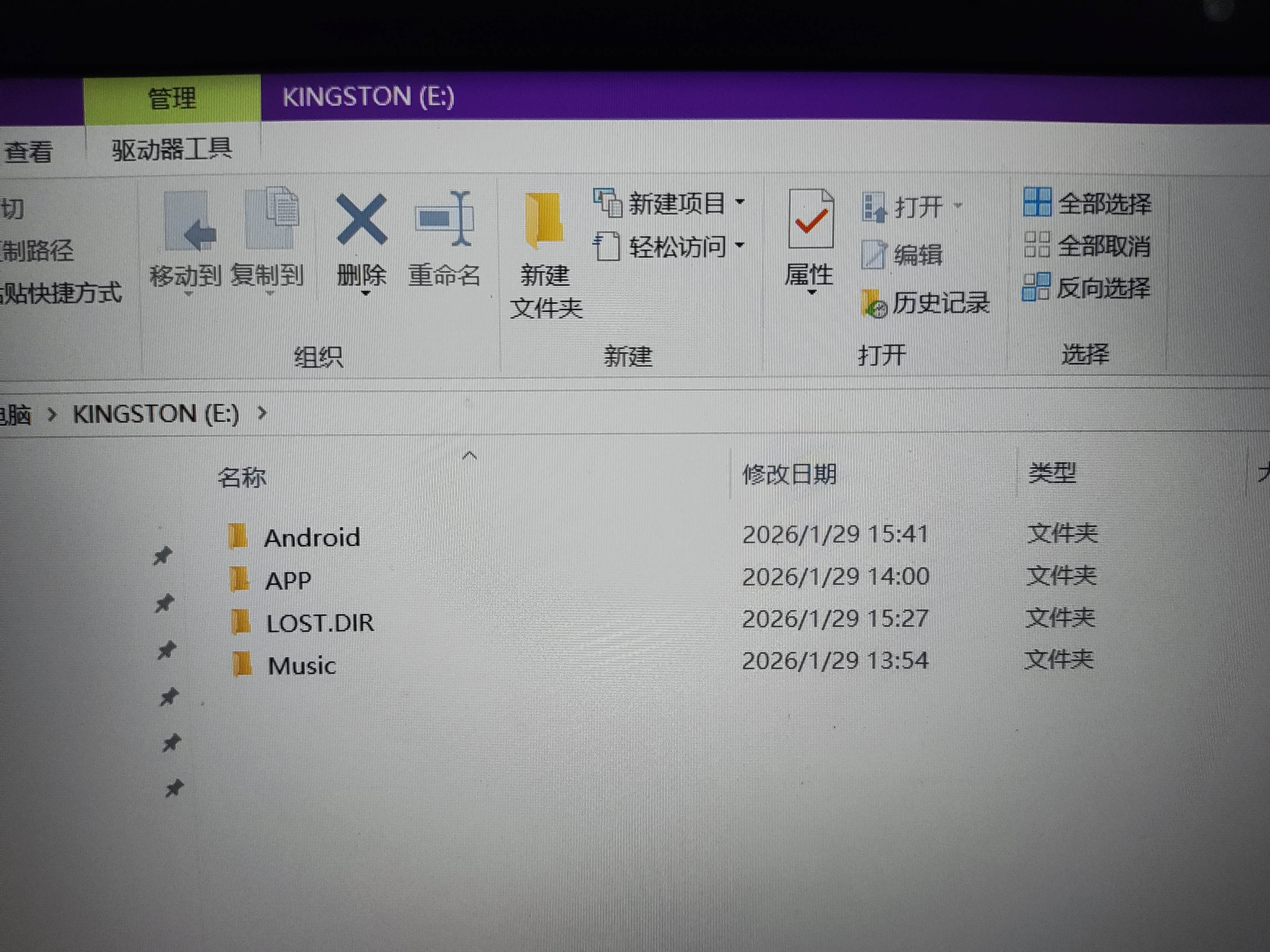 奇怪的是,把空U盘从扶手箱的接口拔出来,重新插回电脑,发现车机系统,刚才在这个U盘里写入了2个空文件夹,Android和LOST.DIR。说明系统是能识别并读写U盘的,但又不知道是哪里出了问题,我们用户却读取不了