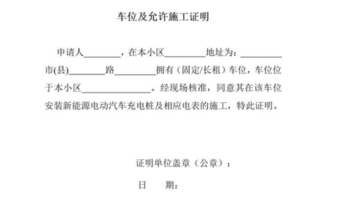 所以在向电网报装之前,电网也会要求你提供《物业允许施工证明》,这个也是有模板的,直接打印找物业盖章即可。这一步,我们小区还是非常顺利的,物业那都打印好了,只需要提供车位购买合同证明你是业主即可(如果是租赁的车位的话,还需要出具业主同意安装的证明)。