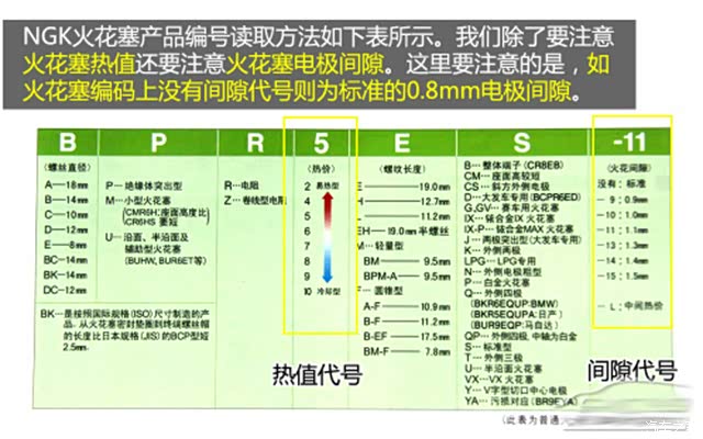 在选购火花塞的时候,首先我们要确定火花塞合不合装,这里就设计到螺纹直径与螺纹长度。而和火花塞性能相关的热值与间隙也是我们必须考虑的。对于NGK火花塞的电极间隙,如果在编号上没有列明就表示是标准的间隙——0.8mm。更具体的NGK火花塞编号读取方法可参看上图。