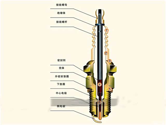 火花塞功用:将高压电引入燃烧室产生火花并点燃混合气。