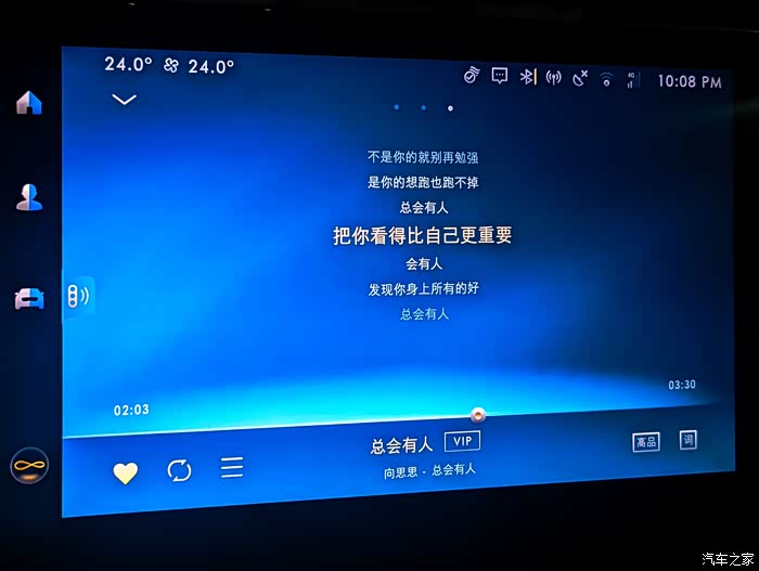 开启座椅通风,开启空调制冷,没几分钟时间,身上基本就干了。听一曲《总会有人》,记住:总会有人,把你看得比自己重要。瞬间,一身轻松悦然。