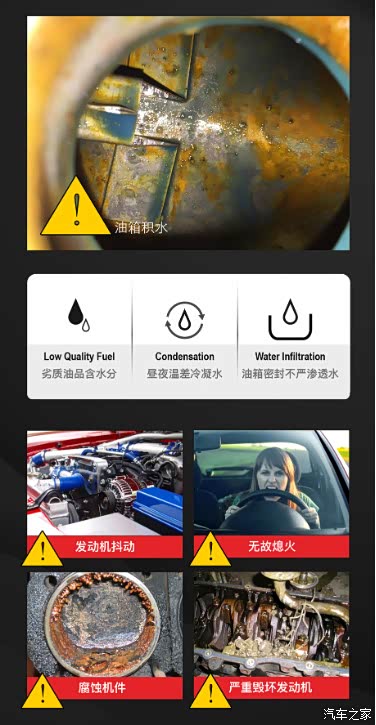 在加入乙醇汽油后,因为乙醇的亲水性和蒸发性,会使得汽车油箱油路中更容易积累水分。长期不处理水分,会不断锈蚀、损坏发动机内部零件,最终导致发动机抖动、无故熄火等严重问题。