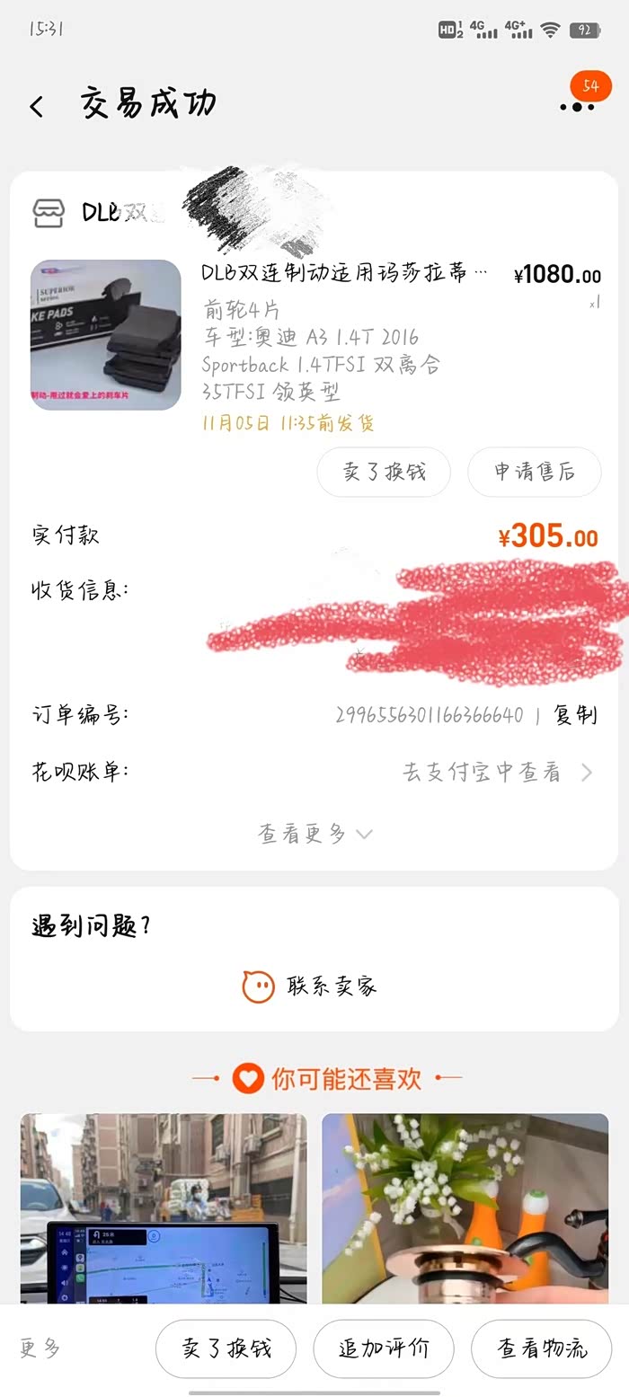 9、刹车异响,我换的改进型刹车片,DLB双连制动品牌,花了305元,刹车立马安静了,连刹车感觉都变得很舒适,不在那么硬了。