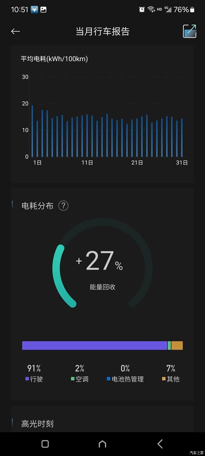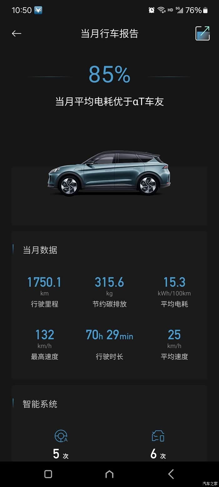 首先全勤奖必须送上,行驶的里程同样也不少,达到了1750.1公里,为地球节约了315.6kg的碳排放。在这70小时29分钟的行驶时间里,我们曾挑战过最高速度132km/h的飞驰,也享受着平均速度25km/h的悠然自得。
