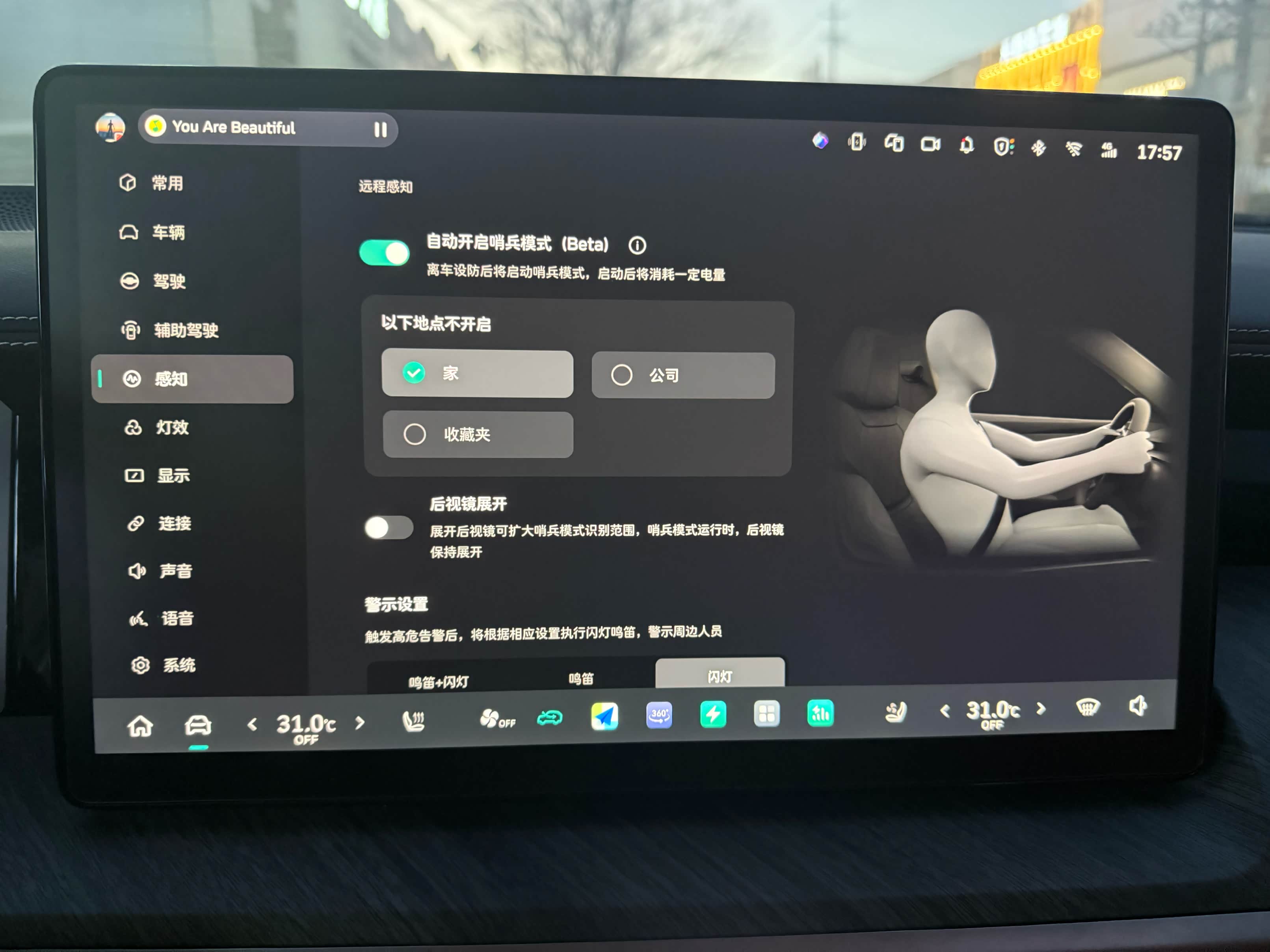 由于梁哥家住在“保安里”,算是老旧小区,也没有所谓的物业和监控,这就让停车变得有些焦虑了,尤其现在还快过年了,车多起来了,更得小心。虽说朋友小区没有监控,但我这台车有哨兵模式,所以停车也不需要过于担心。虽说开哨兵模式心里踏实,但一直开哨兵模式就会有点费电,要是为了安全而影响续航而频繁充电就尴尬了。好在它的哨兵模式可以选择性开启,就比如说我在我家车库停车时可以设置不开启哨兵模式,除了家和公司之外的地方可以开启这项功能,这样可以在一定程度上节省电量,保证出行续航。