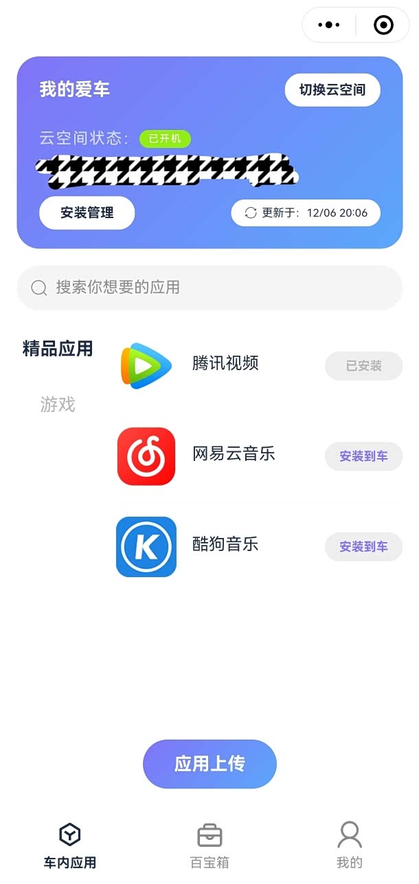 第二步:在车机系统里进入无界空间的页面,扫码登录。然后在“云空间管家”这个小程序里选择“应用上传”,把刚才下载的地图文件上传进去。