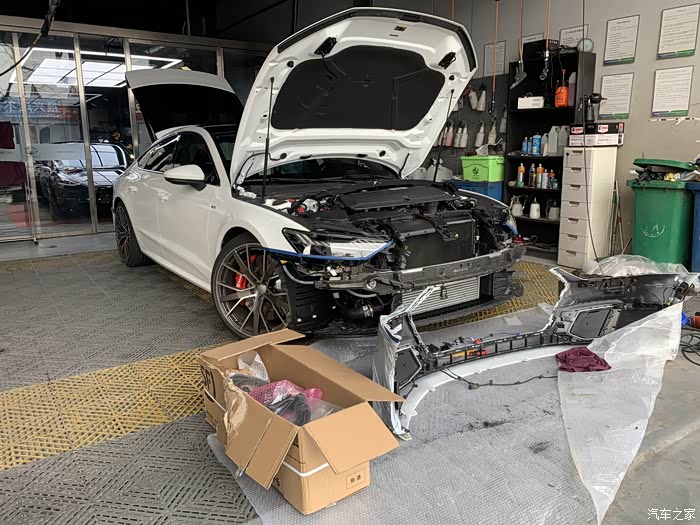 接下来就是我们最不愿意让车主亲自看到的场面了,开拆。做好漆面保护,接缝贴保护美工胶带,前杠拆除,车内也要拆的一塌糊涂,后备箱内饰板也拆的一干二净,都是为了按照原装位安装模块,走线,布线。拆下来的饰板一定要检查卡扣,一些一次性的奥迪卡扣必须更换新的,螺丝也一个不能少,必须安装到位,这样才能保证不出现车内异响。