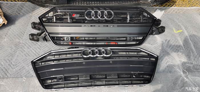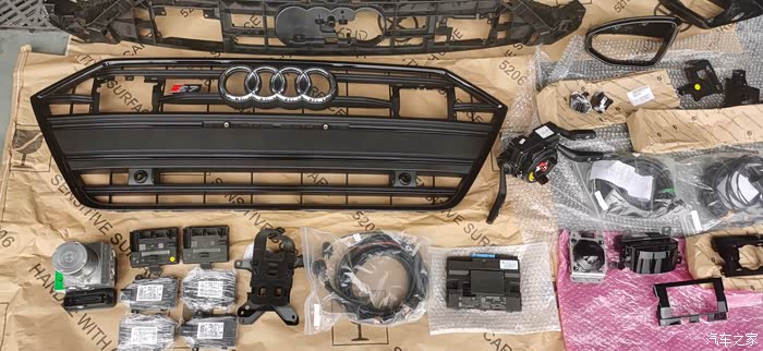 简单介绍一下原产配件的组成,主要的是ACC的电脑模块,探头模块,高配ABS泵,车内的控制模块,以及一些模块支架,线路等。由于原厂中网没有预留探头模块的位置,所以,中网也必须更换为高配中网,以及带变道辅助灯的原厂后视镜壳,车主要求喷黑处理,我们都是使用德国原厂配件。如果使用副厂中网那么有可能会出现探头位置误差,抖动,造成ACC功能报故障,无法正常使用(这个坑我们之前踩过)。还有就是将原厂假排气位改成真的四出尾唇,四出排气的尾喉。