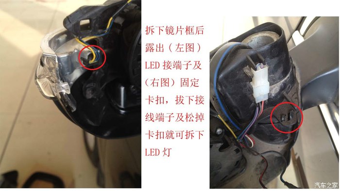 第四步、拆后盖及LED灯,后盖只要镜片框拆下后,水平往后方向拔就行了,只是拆LED灯就要注意如图的地方,且要先拔出照地灯泡后再下卡子,要不灯泡不好拔出。