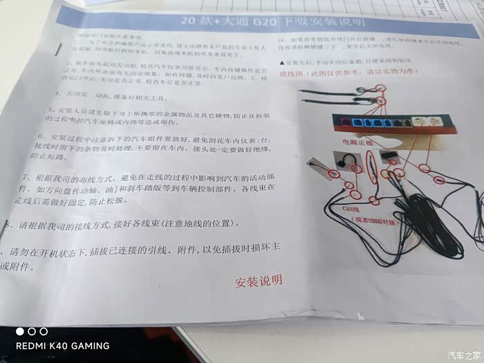 今年3月入手的大通G20柴油版,啥都好,就是不给一个电动尾门,开关尾门巨重,女生更吃力,所以,一狠心,去改一个,去了很多改装店,价格都在3000左右,有点肉疼,所以,还是淘宝一个自己动手吧。改装过程很艰辛,比我想象的难。光说明书打印下来就厚厚一沓,下面有一些照片,给大家看下,别的不难,主要穿线难,这次改装改拆坏了不少内饰卡扣,不过不贵,网上买了30个,也就5元钱,以后有钱了继续改造之旅