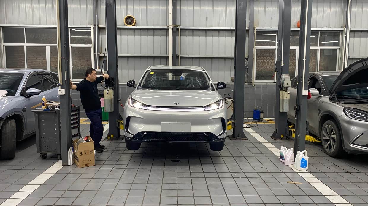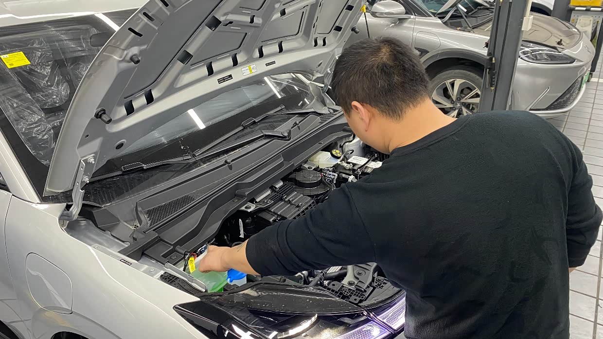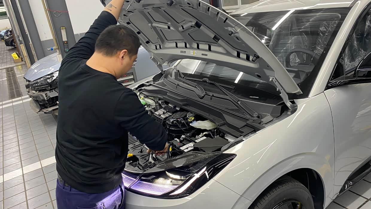 举升机缓缓升起,师傅手持胎压枪为轮胎精准校准气压,指尖划过胎面纹路,不放过任何一处细节。打开机舱盖,规整的机械布局尽收眼底,蓝色的玻璃水注入储液壶,与绿色的冷却液相映成趣,每一次管路检查、每一处接口紧固,都透着对品质的极致追求。