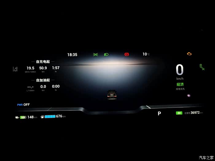晚上18点35分,从重庆出发(总里程36972km),导航显示距离为1349km。出发前油箱加满,表显续航为676km,电量68%,剩余纯电续航148km。以纯电优先模式启程。