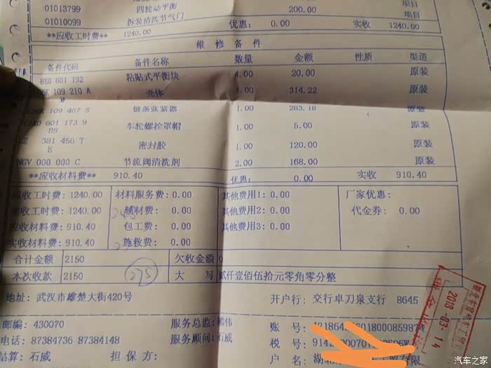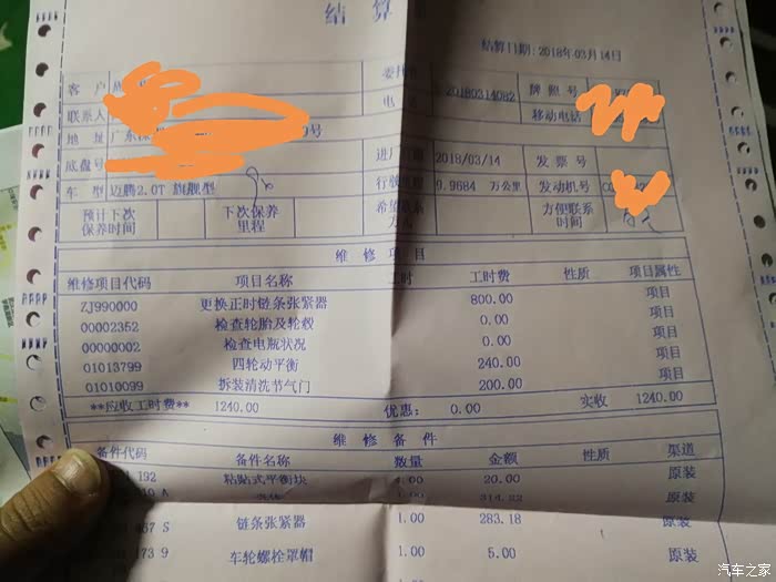 迈腾也差不多快到退休的年纪了,年初计划给家里再添台新车,把老迈退居二线。所以又开始逛起了之家,最近才知道迈腾的正时涨紧器有设计缺陷严重会引起顶气门。惊恐之下立马打电话给各个4S店,各种修理厂询价。最终还是选了4S,今天刚换完。顺便做了四轮定位,洗了个节气门。总共工时加材料费两千出头,由于是会员工时打了8折,个人感觉还行。师傅在拆了正时下盖后检查了链条说链条状态非常好,06H的原车涨紧器行程也还挺长,所以没有换链条。附图是价格,车库里拍的有点暗