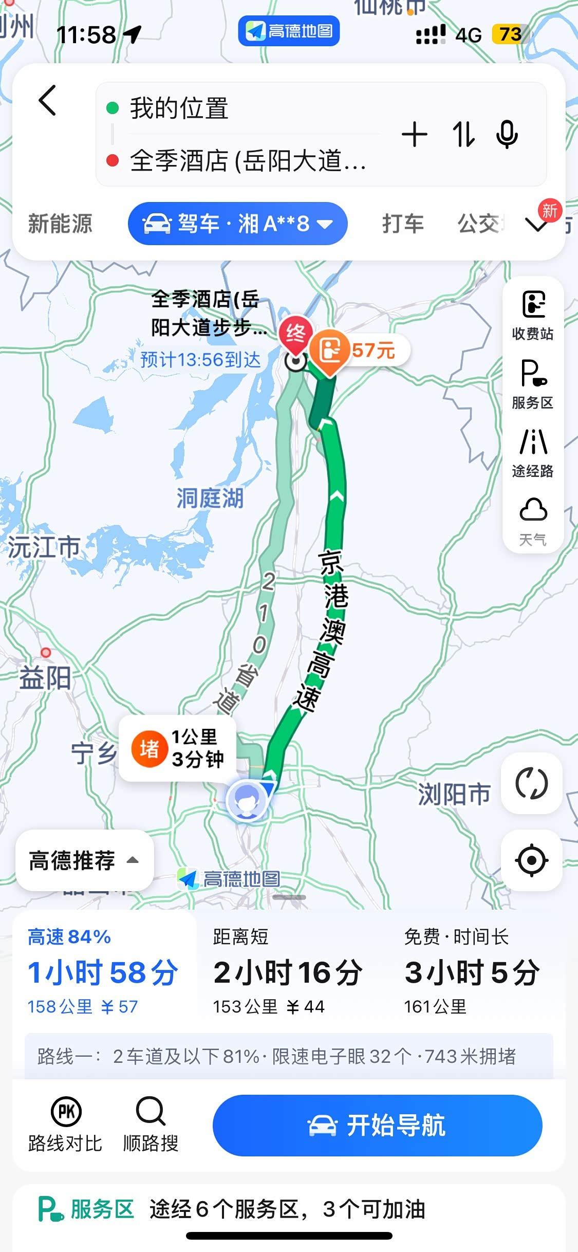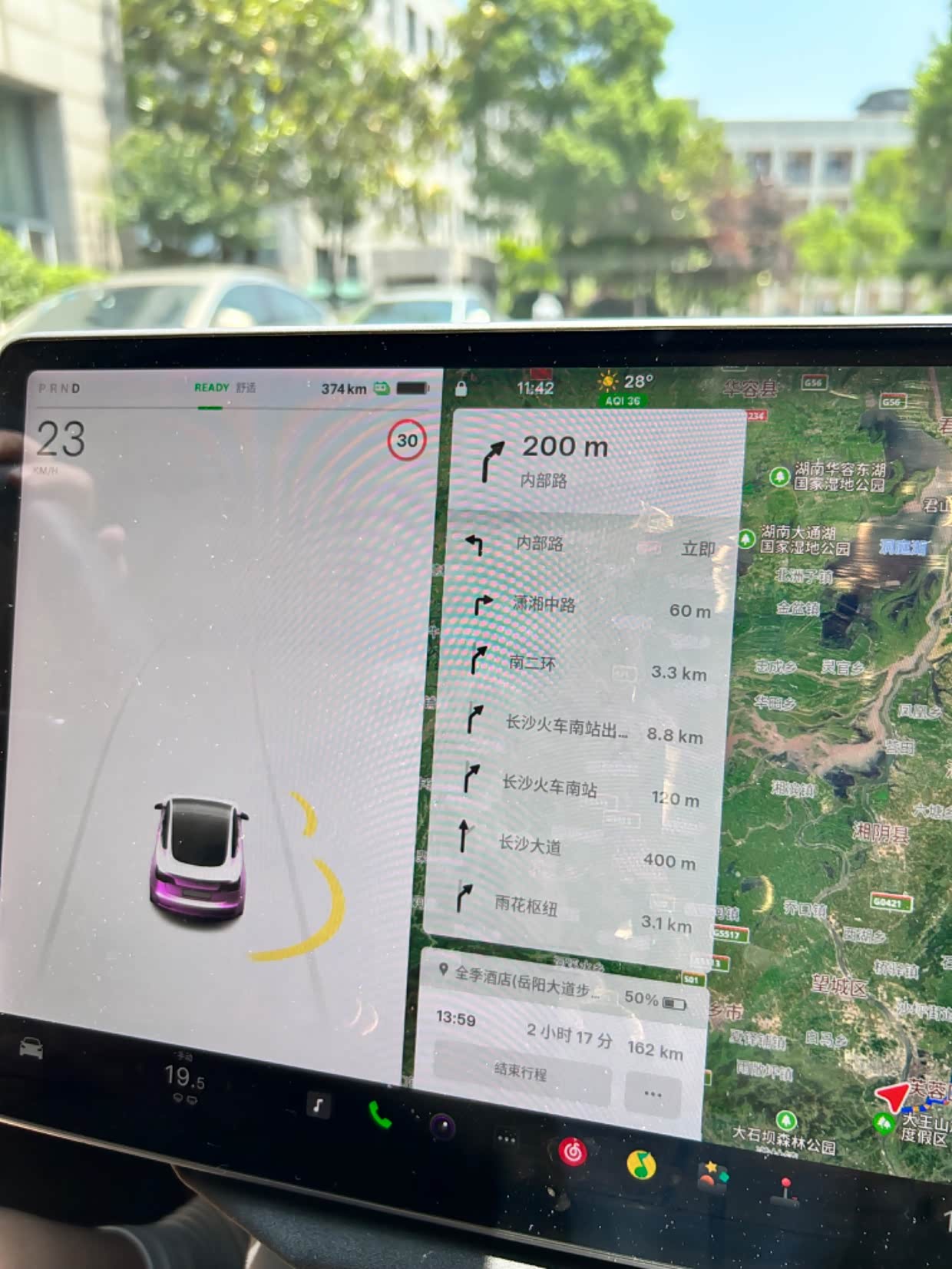 去的时候,目的地为岳阳市全季酒店,中午11点42出发,此时特斯拉自带导航显示预计用时2小时17分钟,下午13点59到达,距离为162km,预计到达时电量50%。此时表显94%的电量,对应续航374公里。从系统中也可以看出这台车行驶里程超过5万公里,平均电耗在13.8kwh/100km。