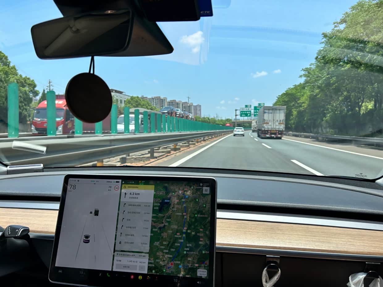 刚开始我采用特斯拉车机自带导航,但因为其表述不清,在多叉路口处提示不够清楚,最后还是开启了手机上的高德导航,此时还有158公里。去的时候走的京港澳高速,这条高速上大货车特别多,路还窄小,只有2条道+1条应急道,很难跑起来速度,在很多地方速度都只能跑到70km/h,空调开到19度4档风。