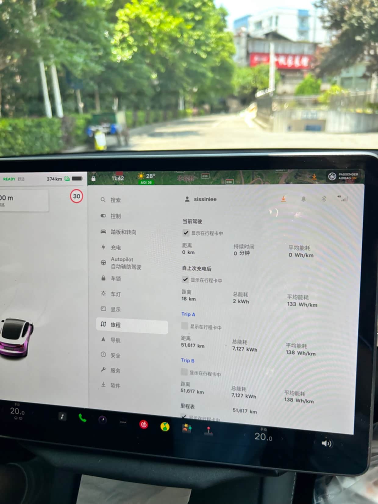 回去走的是许广高速,这条高速比京港澳高速要宽且车少,开的很快,最高时速达到了140km/h,空调依旧是19度4档风,玩的就是真实,想测一下特斯拉model3的真实高速能耗,可以看到Trip B记录了高速跑了142km,平均能耗159 Wh/km。此时总共跑了158km,高速口到我家在长沙市区还有18公里,再次把Trip B清零,看看特斯拉model3真实市区能耗。