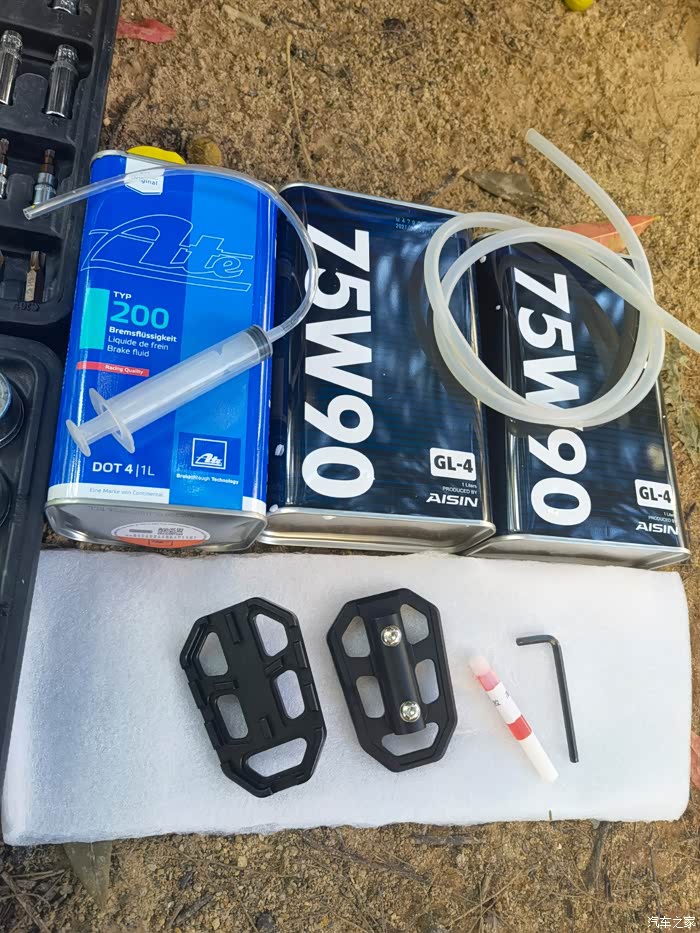 刹车油选用DOT4级别,齿轮油使用爱信手动变速箱75W90齿轮油,原厂也是指定75W90的,其实只要180毫升,家里有几辆踏板摩托车,所以多买了些。加大脚踏是铝合金的,配了液体生胶带,卖家很贴心,以后不用担心路上会震掉。