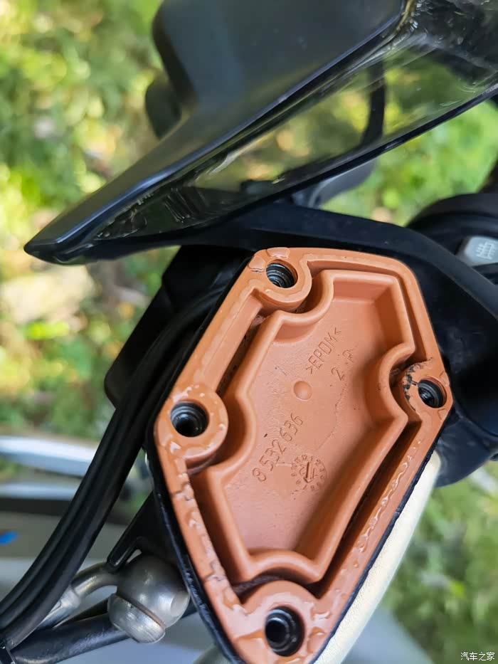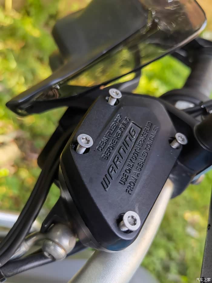手把右边是液压油壶,由四个螺丝固定,左边油壶是液压离合器油,我拆开看过,离合器的油和刹车油是不一样的,所以不要加错。