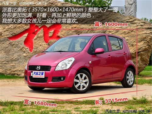 由于派喜的造型十分可爱,所以从图片上来看可能会让人觉得它和奥拓差不多大小。其实不然,派喜的车身尺寸为3715×1680×1600mm,比奥拓整整大了一圈,而轴距方面派喜与奥拓同为2360mm。所以从产品定位来看,派喜属于小型车的范畴,而奥拓只是一辆微型车,派喜更为直接的对手应该是赛欧两厢这样的小型车。