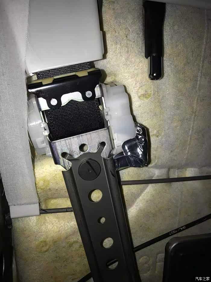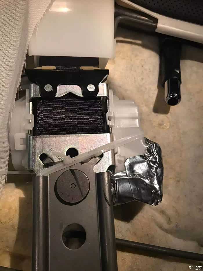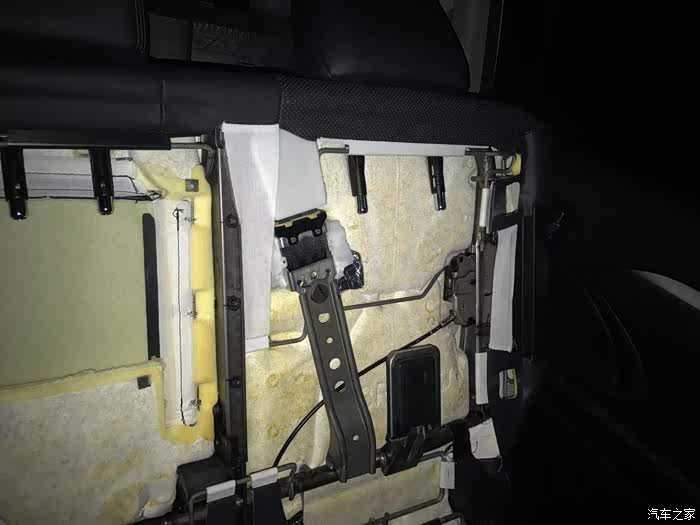 车子行驶过程中第二排座椅总是发出轻微的金属撞击的嗒嗒嗒的异响,尤其车窗玻璃关闭的时候那个声音很不舒服。4S店也没有解决,今天决定自己把异响的地方找出来,还真找到了异响的地方是第二排右边6分座位。轻松解决。首先把6分座的靠背放平把后面板拆下来,是由9个卡子固定的,下面边缘有3个卡子左右两边各两个正中间还有两个,九个卡子松掉后向后拽异响就整个下来了。是靠背后面的安全带收紧器在共振的情况下发出的嗒嗒嗒的声音,我用扎带把它固定了一下就不响了。直接看图吧!文化有限表达不清敬请见谅!