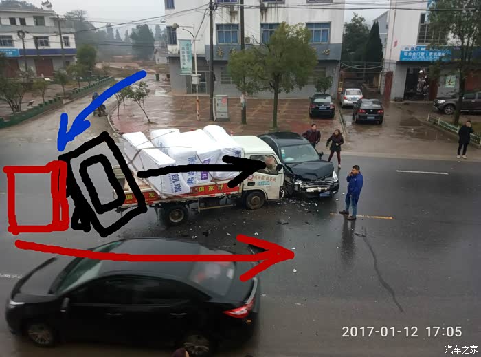 画图说明:红色箭头是白色小货车正常行驶路线,蓝色箭头是黑色老款轩逸正常行驶路线,黑色箭头左侧是撞击位置,右侧是撞击后位移的10多米后位置