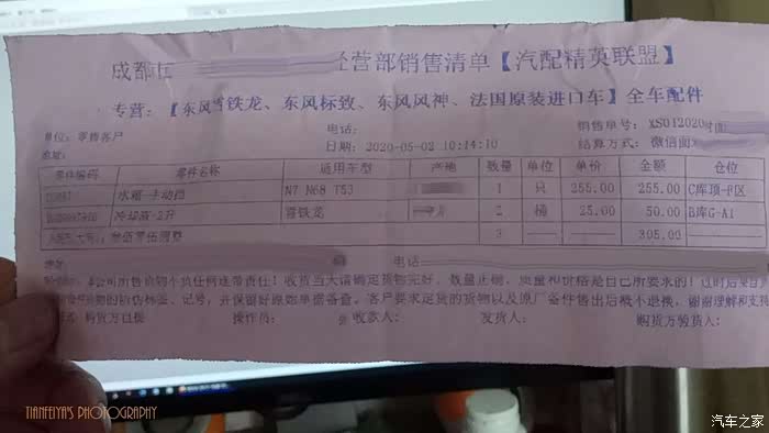 由于是五一假期,汽配市场放假休息,买配件就成了难题,X宝上也要几天到货,这可等不得的事啊,于是还是冒然去汽配市场,在5%的开业店家正好有家标致雪铁龙配件店在营业,很顺利的买到了配件,水箱和两桶防冻液。