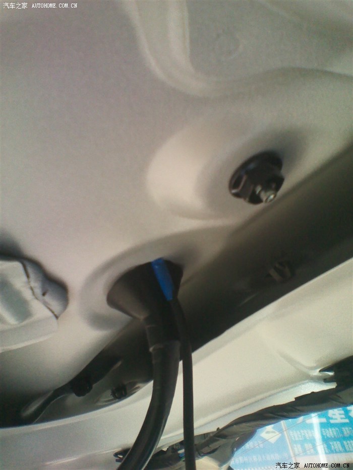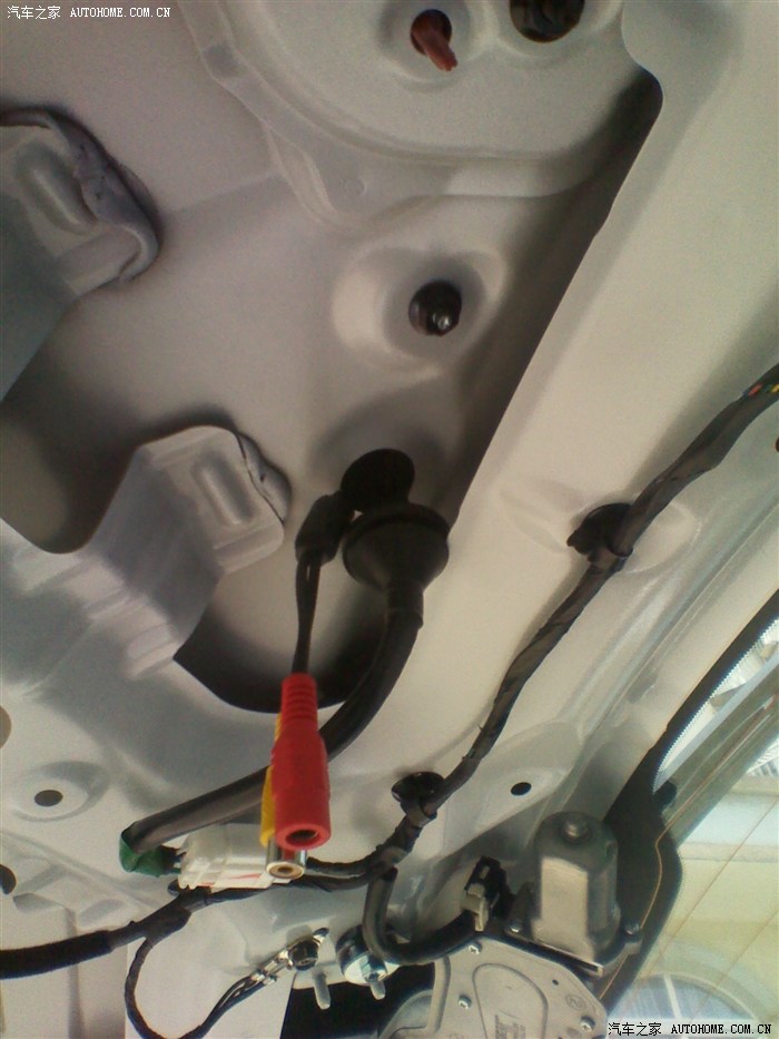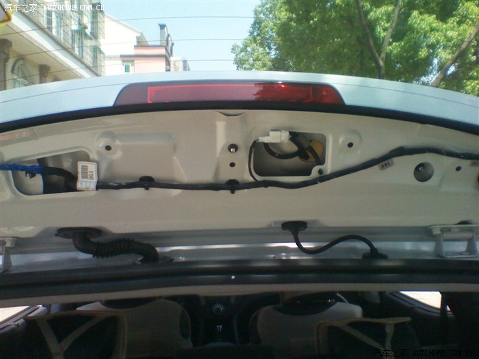 第六步:按原车走线用胶布一边缠一边走,走到后备箱盖和车身连接的胶筒处,把两边的胶筒底座都拔出,用铅丝引线穿过(必须把头部的插头线剪断才穿得过,后面再接上) 把下面的后备箱灯取下可以把空间撑开 好引线。如图: