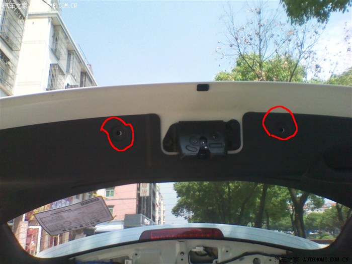 第五步:拧下牌照灯的螺丝,拔出灯泡 取下灯壳,换上带摄像头的灯壳,我这边是右边位置的,然后把牌照灯电源线过来的密封胶圈拉下,用铅丝从里面穿到摄像头位置把摄像头线穿过去 和铁边缘接触地方多缠胶布。如图: