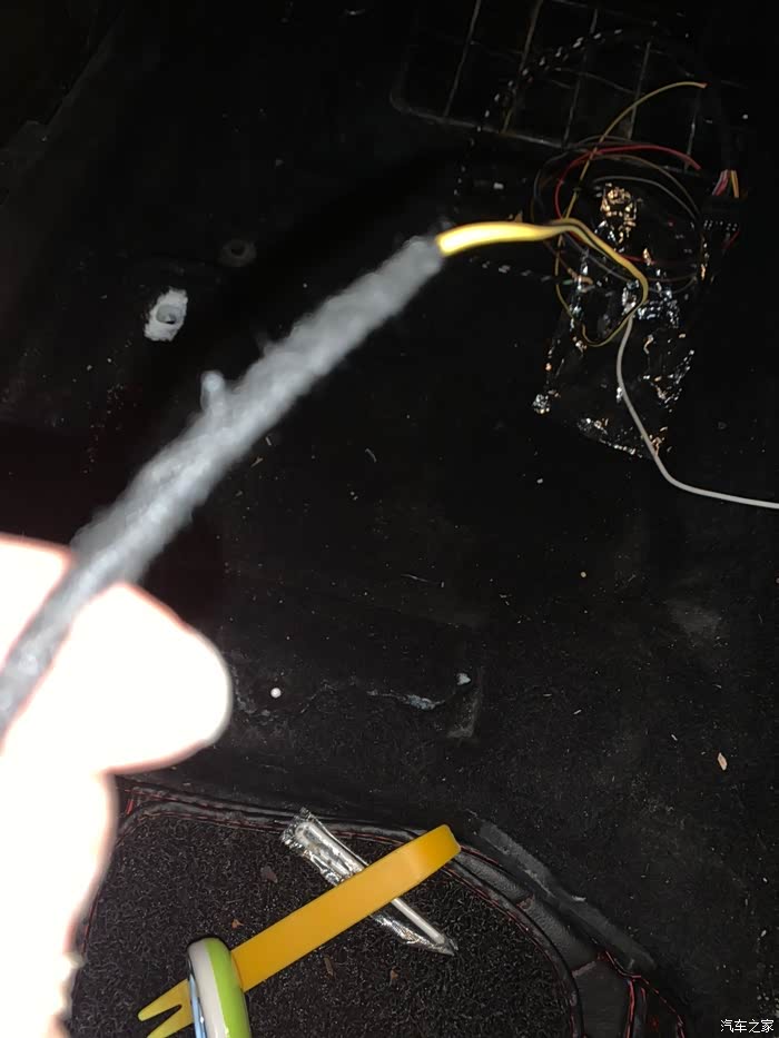 布线布成了这样,模块无法安放,卖家说放座椅下面,但是根据线的实际长度,是无法做到放座椅下了,考虑可以放到中控屏里面位置。最后在油门旁边上方找到一个空位,用塑料扎带固定了。线束做到了没有妨碍油门和刹车。