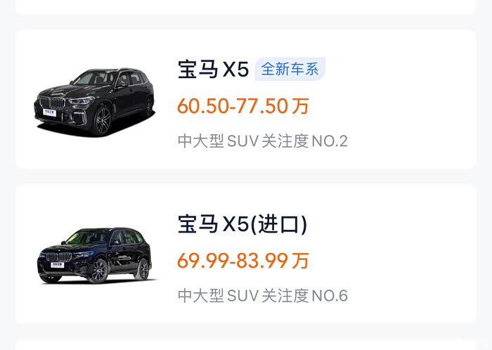 国产X5虽然加长,空间变大,但总感觉有一种拉垮的感觉(绝对不是酸,真心话),无论是外观还是内饰设计,还是网友们说的动力、皮质、底盘减配什么的,都给我一种把X5档次给拉低的感觉。但是价格确实跌下来不少,起码入门款降了近10个W,圆很多人一个X5梦也是一件不错的事。