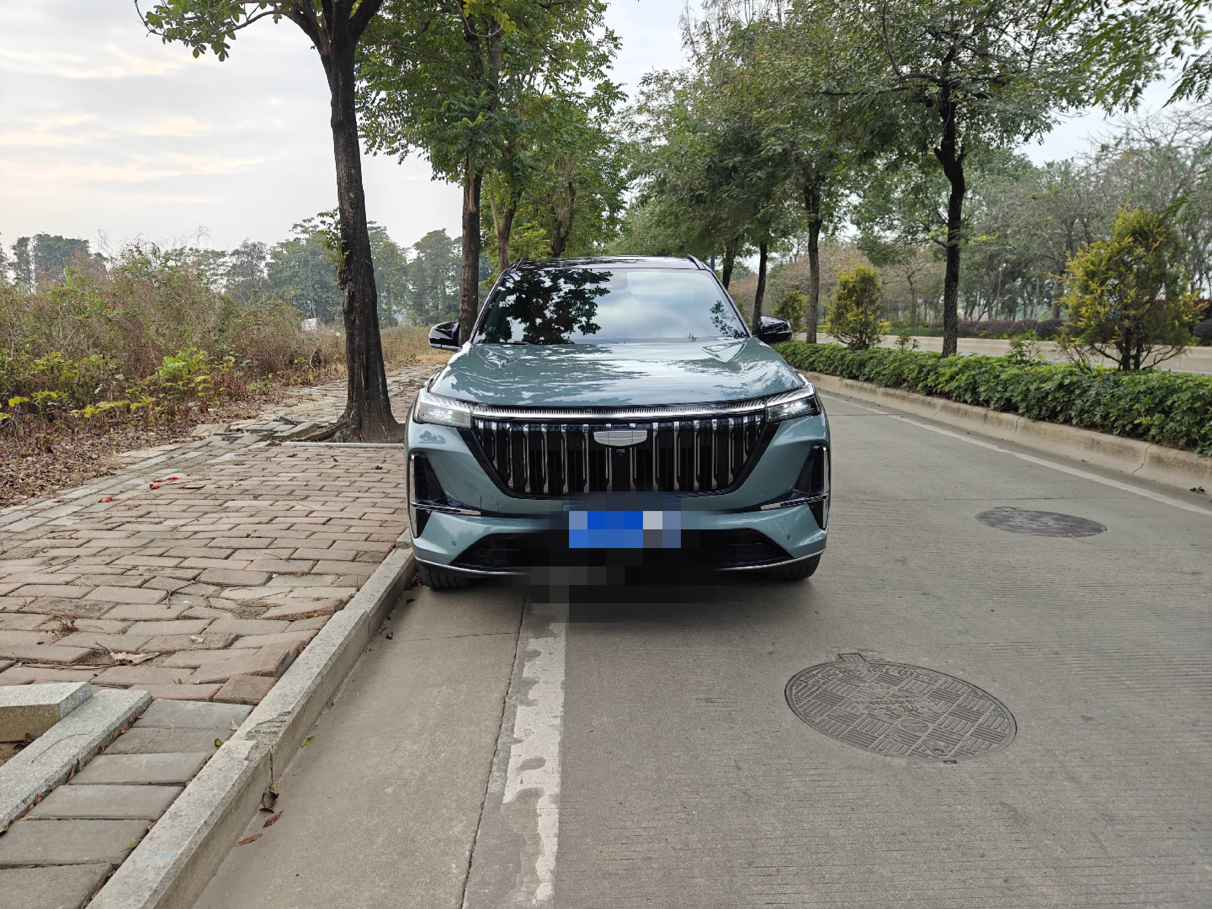 在25年11月份的时候,终于把我的吉利博越L山河版开回家了,选的远山青+黑顶配色,看到实车的瞬间,之前等车的焦虑全散了。低饱和的青绿在阳光下泛着细腻的光泽,搭配熏黑悬浮车顶,比官图里还要耐看。