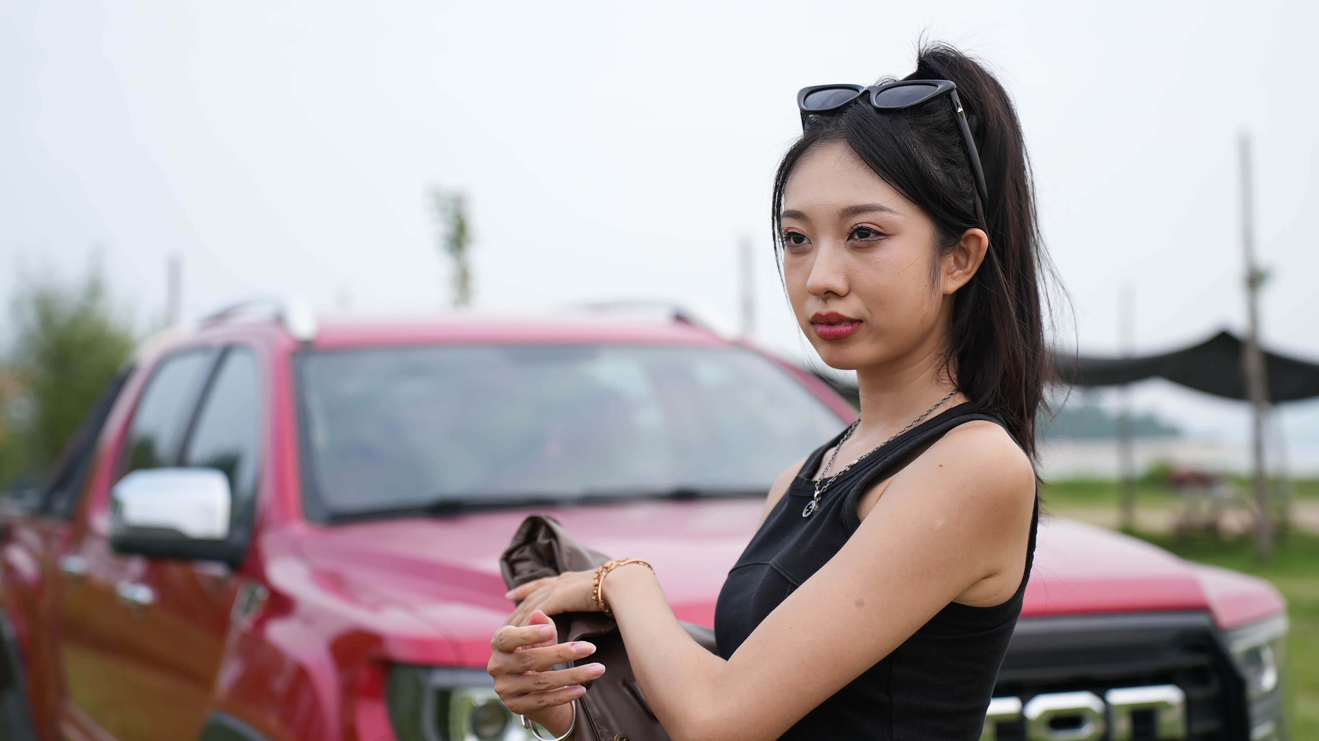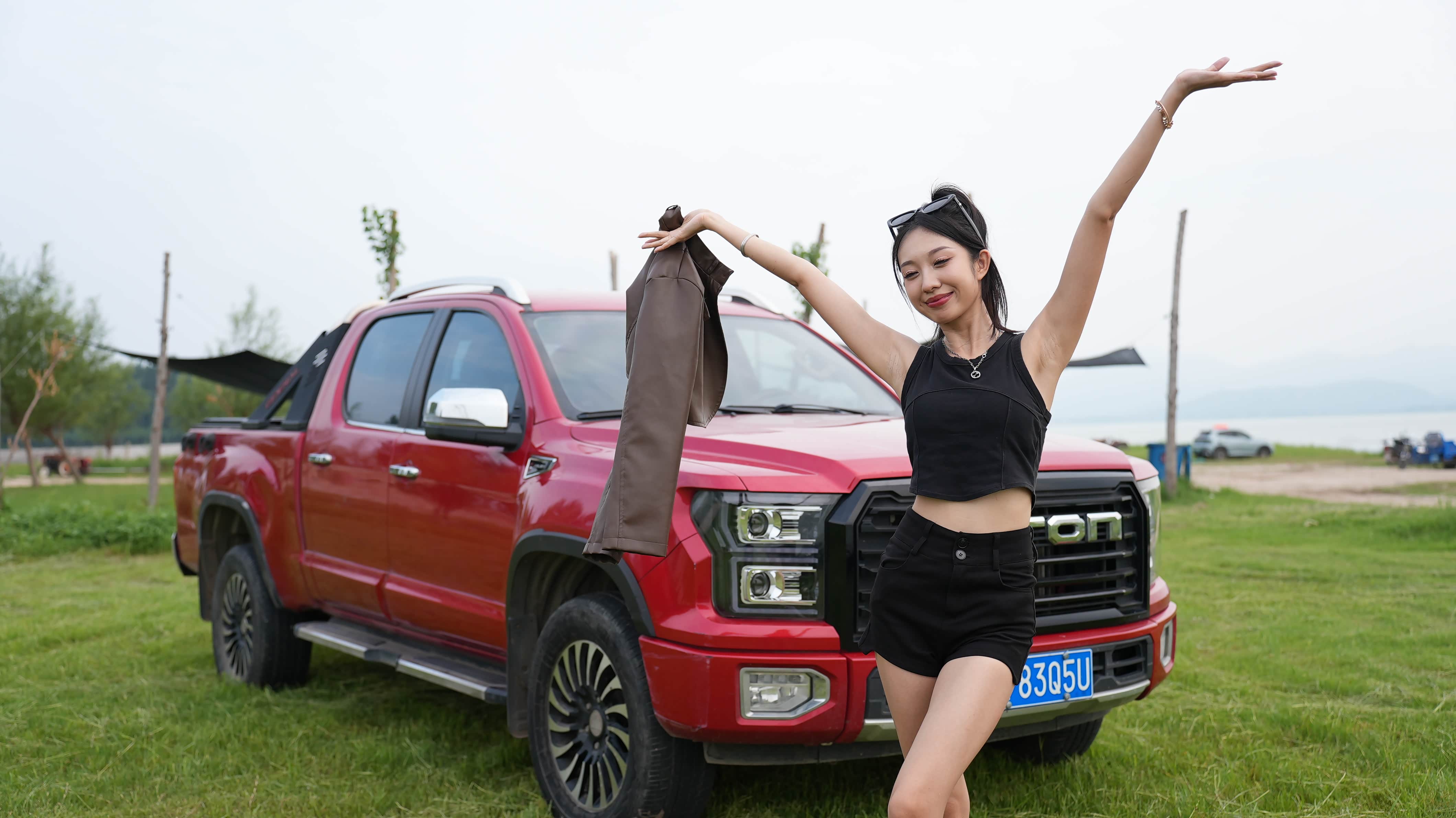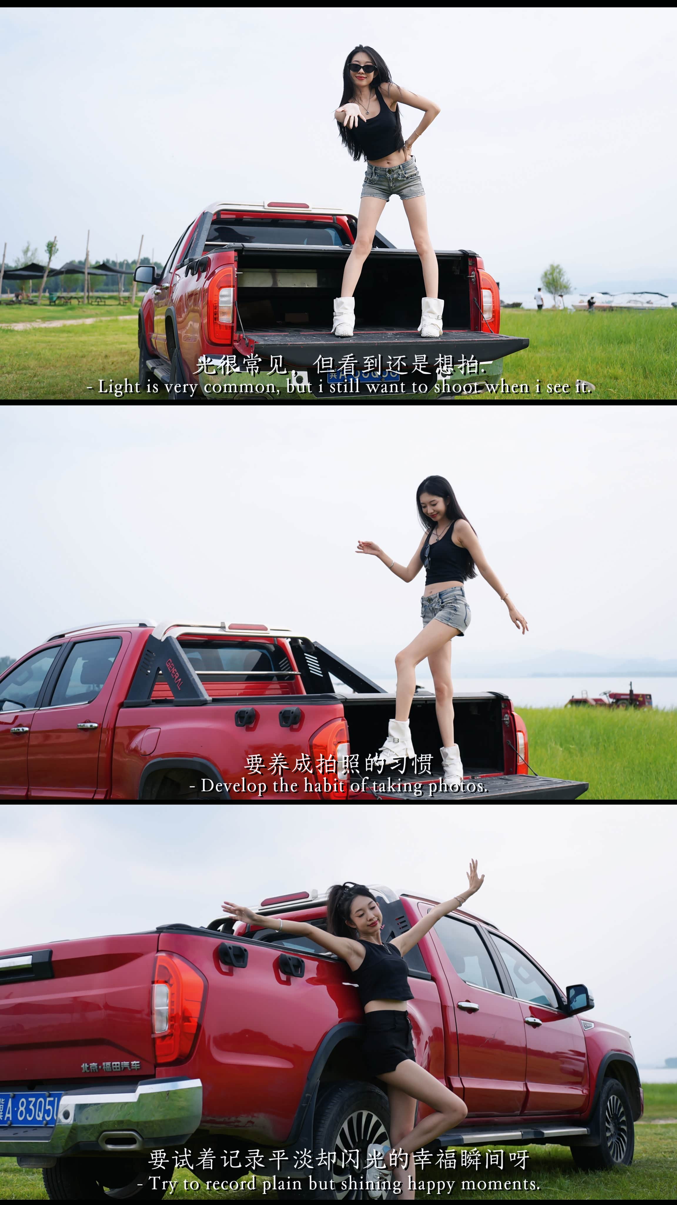 3. 互动产生故事感:别光站着!让媳妇尝试一些和车的互动。比如,假装很费力地去够G9那高高的门把手(突出车的大和她的娇小);或者调皮地只从巨大的后斗里探出个头来笑,虽然身材娇小,但眼神可以故意装得很“飒”。这些互动瞬间,手机连拍抓起来,特别生动有趣!