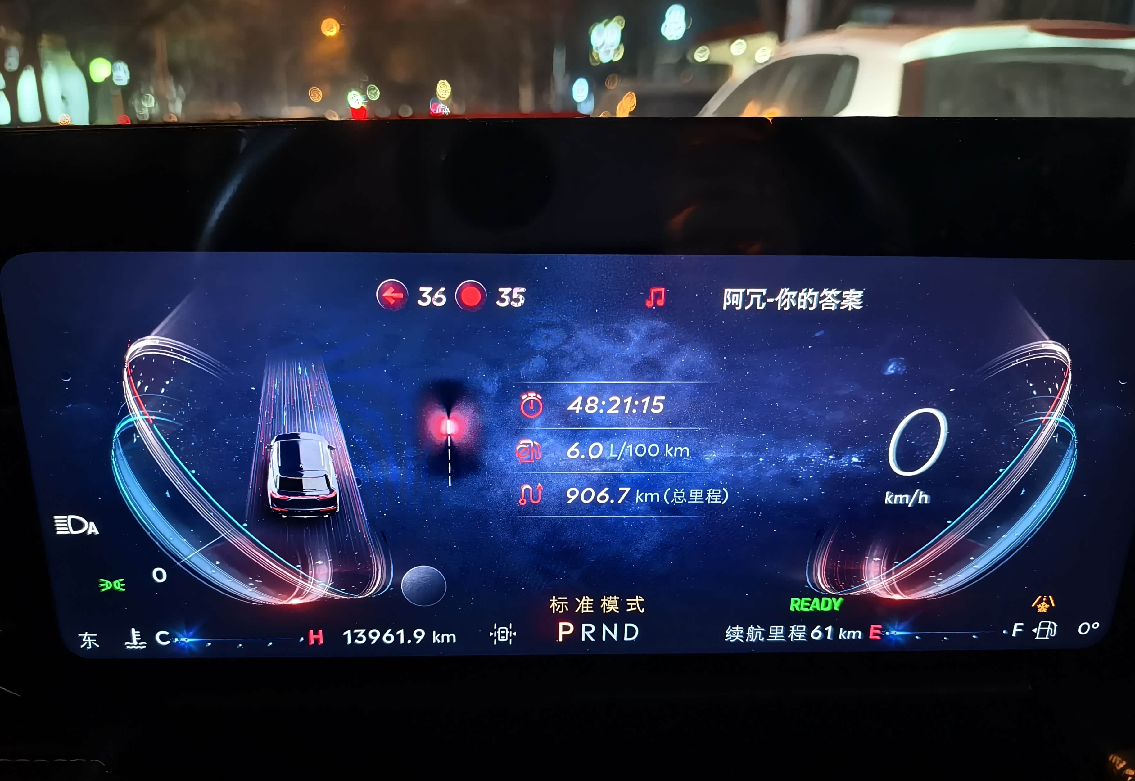 以我今天刚刚加满的这箱油为例,上次加满油后里程1清零,本次加油前表显里程1已行驶里程906,剩余里程61,也就是表显续航里程967,油耗6.0。(气温0度)
