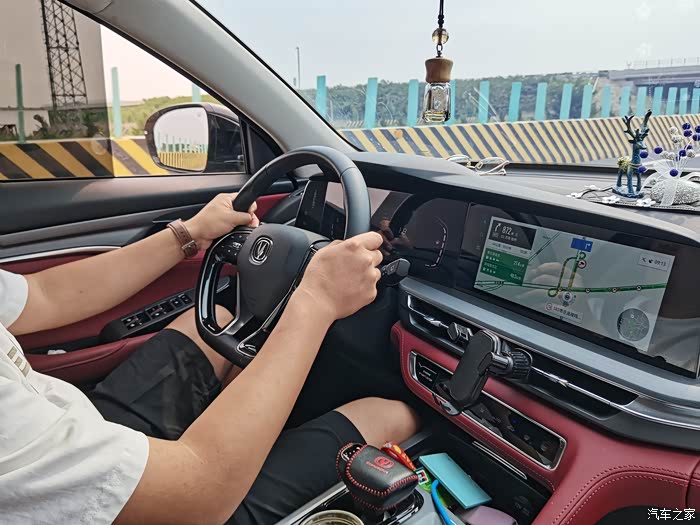 开车的时候双手扶着方向盘,安全可靠的配置,我们跟随着车机系统导航更加的精准