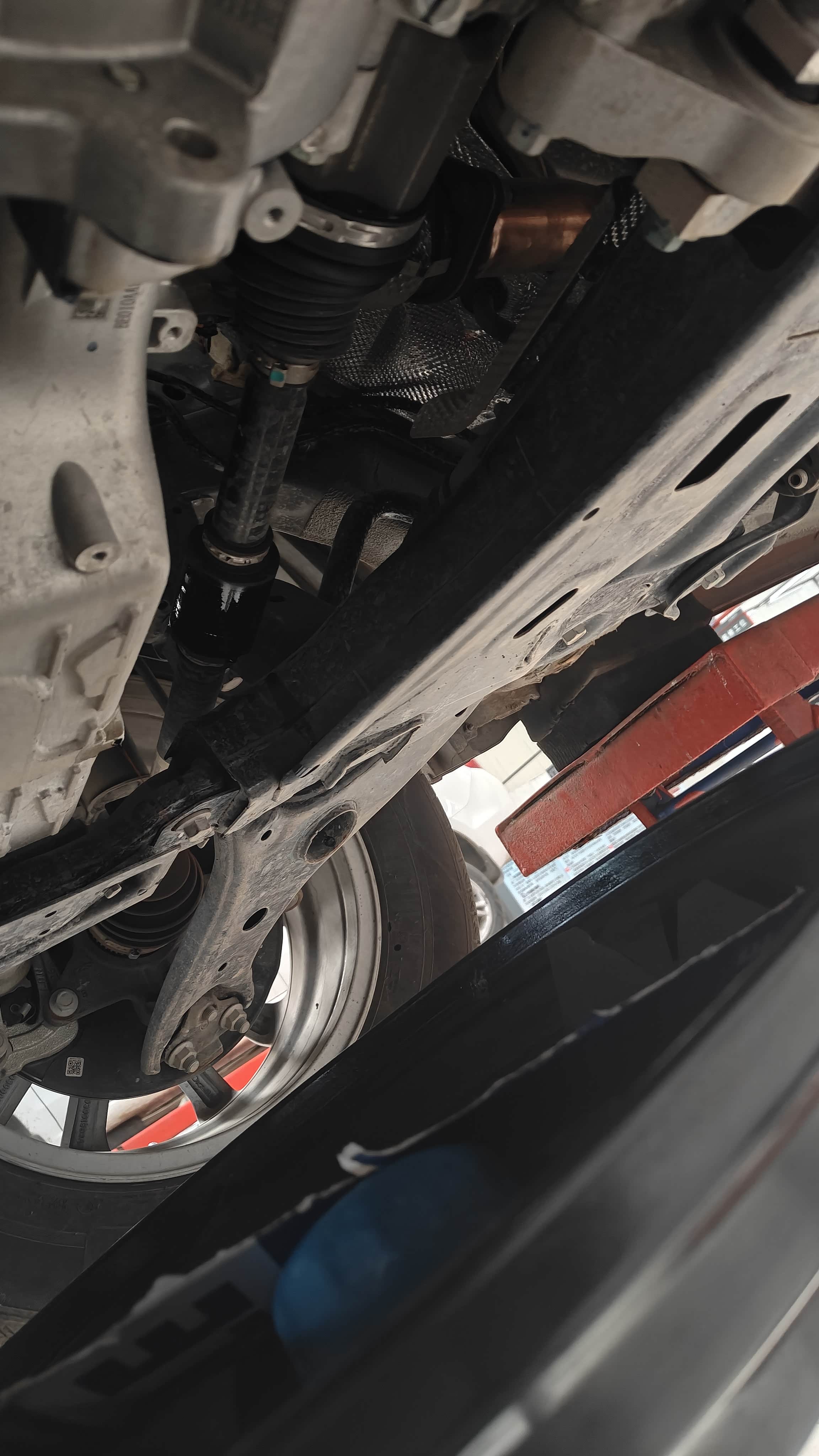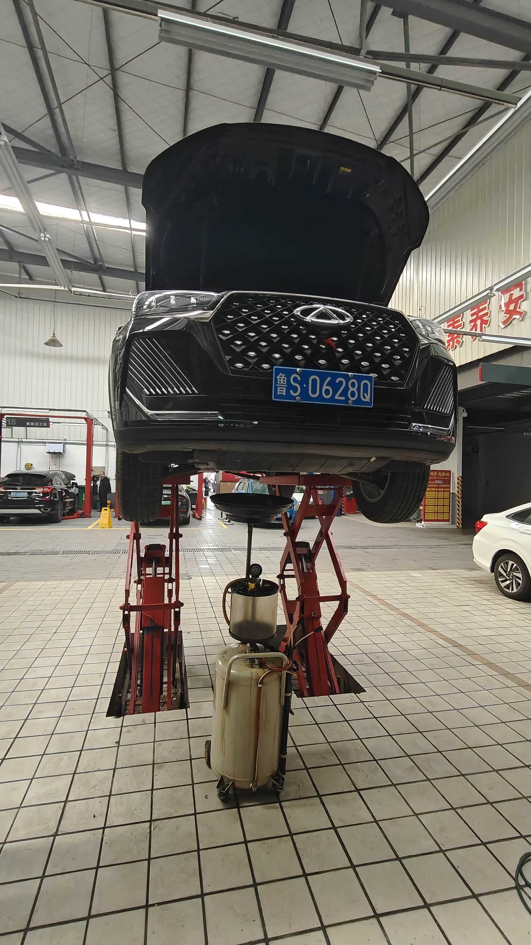 我的车被安排在10号机修工位,师傅先是打开发动机盖,开始检查各种油液。接着,车被举升机高高架了起来,我第一次这么清楚地看到它的底盘。师傅拧开油底壳的螺丝,黑黢黢的旧机油就流了出来,看着那颜色,才意识到保养确实不能偷懒。