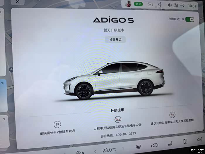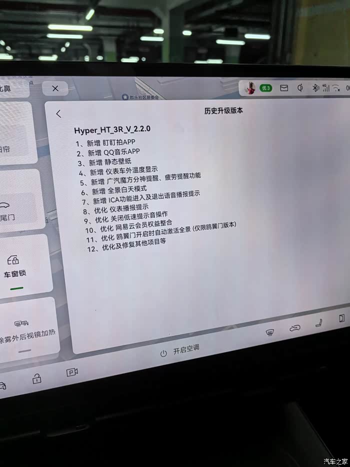 来到这次OTA升级,根据官方消息,升级从6月5号就开始推送了,但是因为是分批次、分区域的升级,也不知道什么时候能升级上,自从上次升级完以后就开启了夜间自动升级功能,了解了这次升级新增的一些功能,比如车外温度显示、新增QQ音乐应用等,就一直在早上关注仪表盘上的温度信息。终于在6月11日早上开启车辆后看到了仪表盘右下角的温度信息,知道晚上已经给升级完了,随后的通知也跳出来了升级的内容信息,后续就尝试着登录了QQ音乐、看了下新增的壁纸,还是那句话能升级总归比不能升级要强,期待跟车友们一起提的优化建议在后面的一次次升级中实现。继续出发!